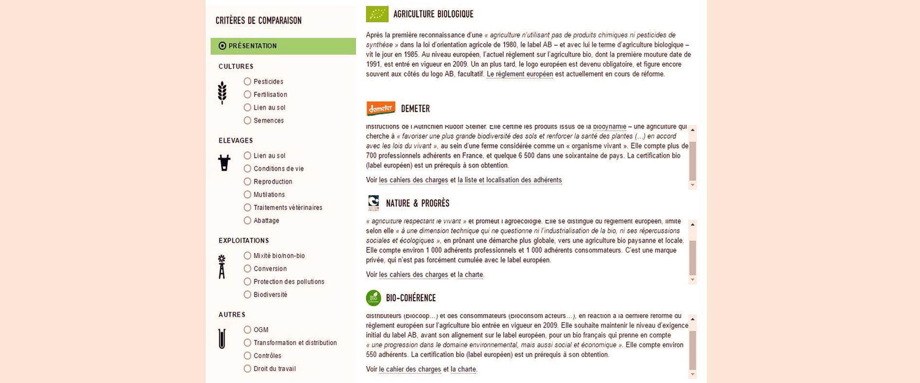 Dans les colonnes du Monde à la rubrique « Les Décodeurs », Angela Bolis et Gary Dagorn nous proposent ce comparatif des labels bio. Petit rappel : « Ces trois marques [Demeter, Nature & Progrès et Bio-Cohérence] revendiquent une démarche plus globale, qui ne réduirait pas le bio à une liste de critères techniques et sanitaires, mais engloberait des exigences environnementales (comme la biodiversité), sociales (comme le droit du travail), économiques (comme l’autonomie de l’exploitation) ou encore éthiques (comme le bien-être animal). C’est un bio plus entier qu’elles proposent, plus confidentiel aussi, qui entend surclasser le minimum réglementaire valable d’un bout à l’autre de l’UE. »